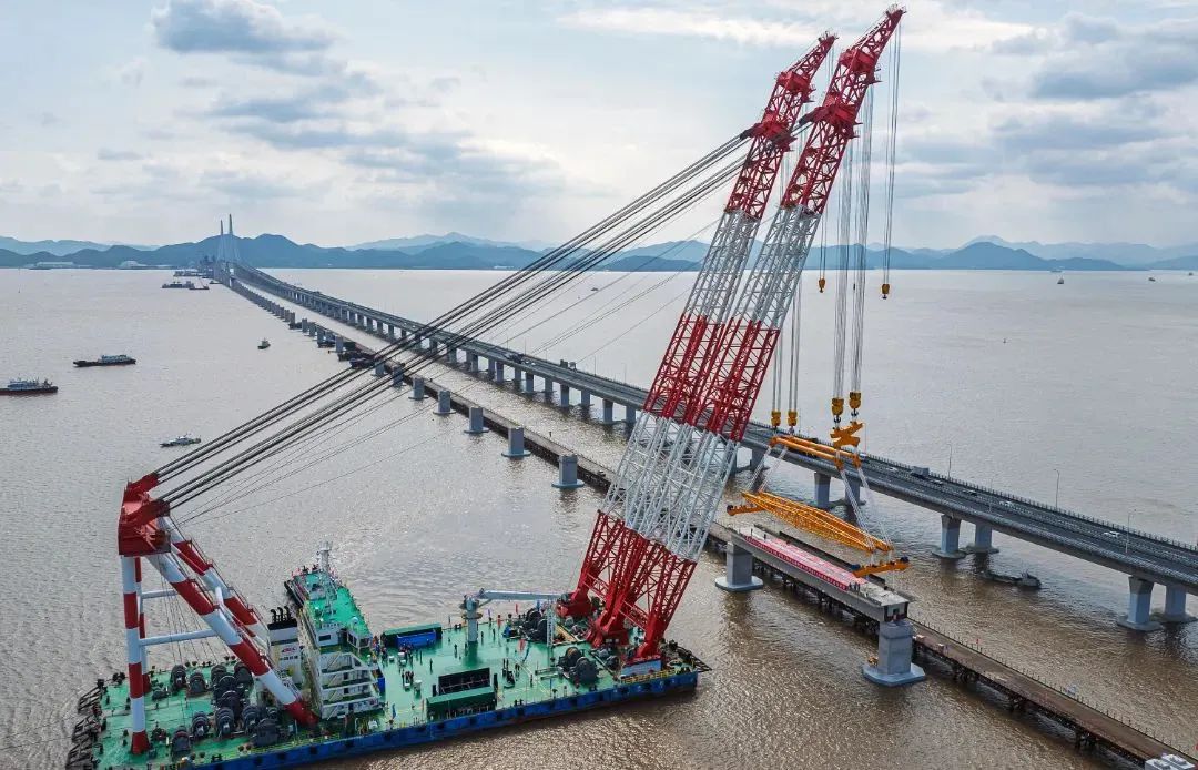 大橋海上架設(shè)預(yù)制箱梁共66榀,每榀梁長(zhǎng)60米,寬10.6米,重約1700噸,吊具重280噸,總體起吊總重1980噸,是國(guó)內(nèi)市域(郊)鐵路工程跨度最大、噸位最重的預(yù)應(yīng)力混凝土預(yù)制箱梁。