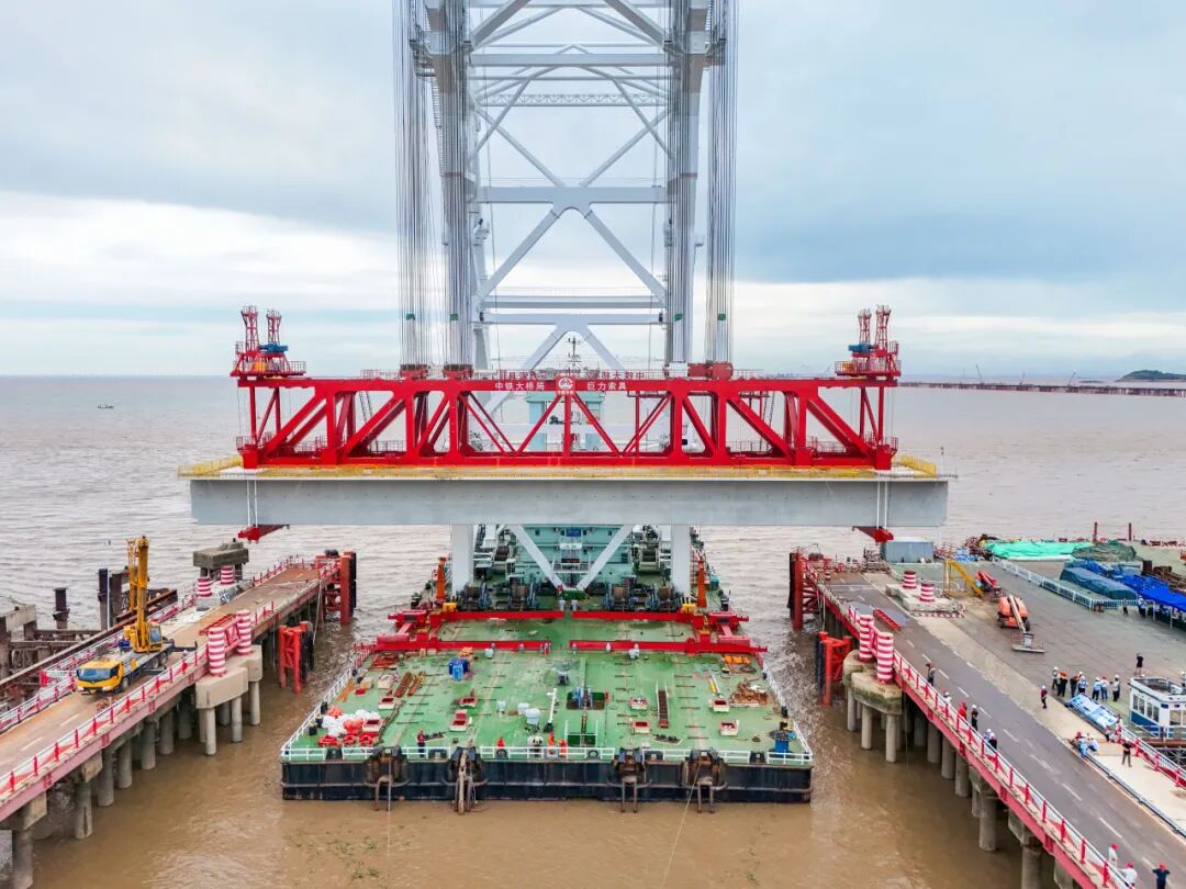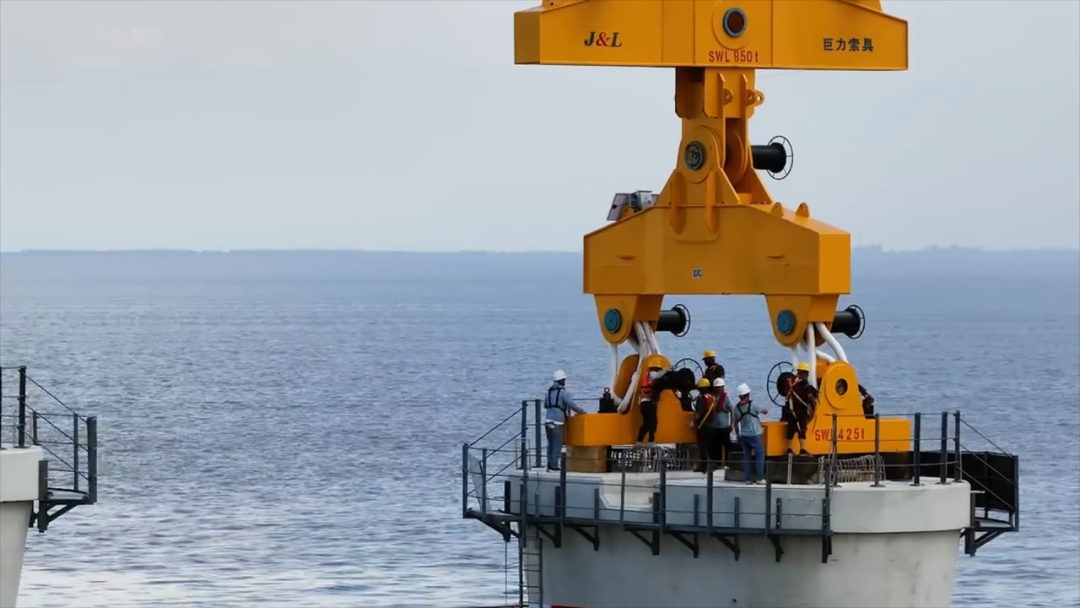 巨力索具生產(chǎn)制造的預(yù)制箱梁吊具與中鐵大橋局研制的“天一號(hào)”運(yùn)架一體船協(xié)同作戰(zhàn),采用“低平潮取梁、漲潮期運(yùn)輸、平潮期落梁”的精準(zhǔn)調(diào)度方案,克服了海域潮汐變化大、海上風(fēng)浪干擾強(qiáng)、運(yùn)輸距離長(zhǎng)等諸多施工難題,將落梁誤差控制在毫米級(jí),最終將這新一代“世界梁王”架設(shè)到位。