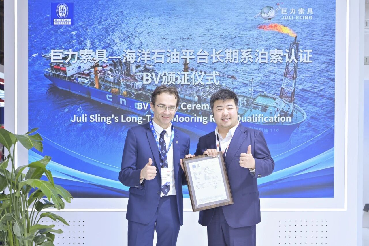 在2025中國國際海事會展期間,法國船級社(BV)向巨力索具頒發了“海洋石油平臺長期系泊索”專項認證證書。這項認證是針對海洋石油平臺長期系泊索這一技術門檻領域的專項認證,是對巨力索具深耕深海裝備技術的最佳注腳。