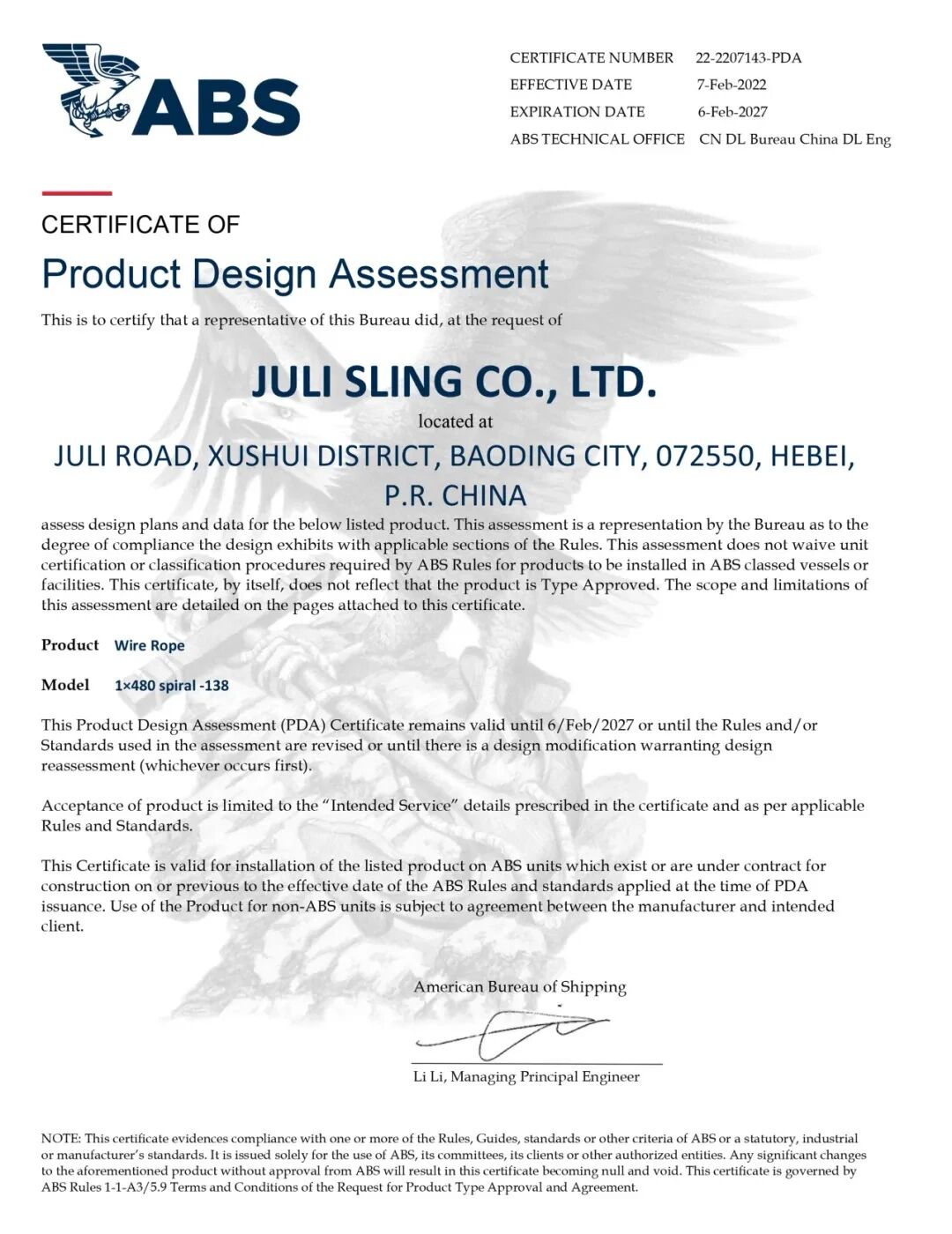 △ 美國船級社(ABS)單股鋼絲繩ABS設計評估證書