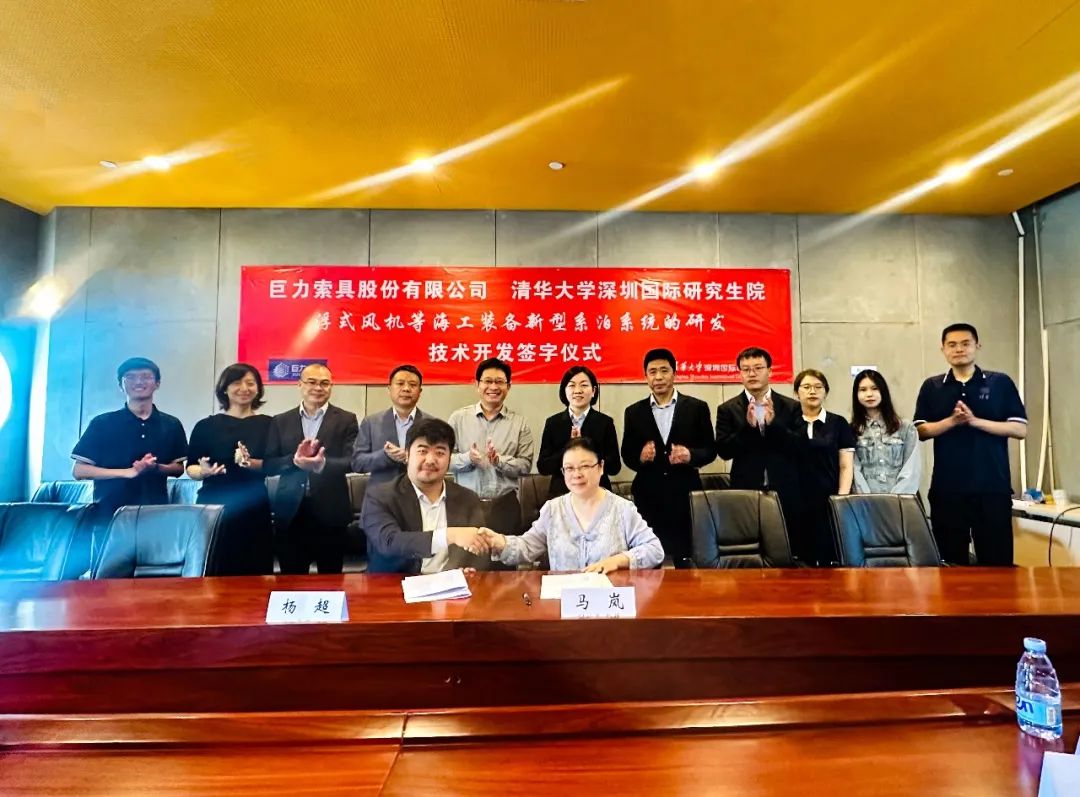 2023年4月13日,巨力索具與清華大學(xué)深圳國(guó)際研究生院就浮式風(fēng)機(jī)等海上漂浮式構(gòu)筑物新型系泊系統(tǒng)的研發(fā)達(dá)成技術(shù)開(kāi)發(fā)合作關(guān)系并舉行簽約儀式。